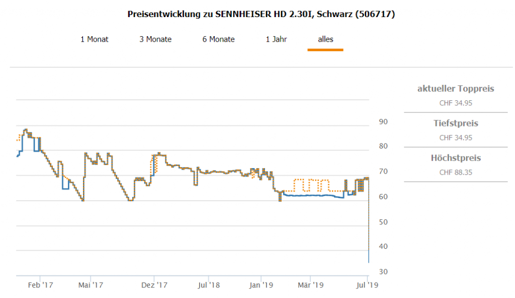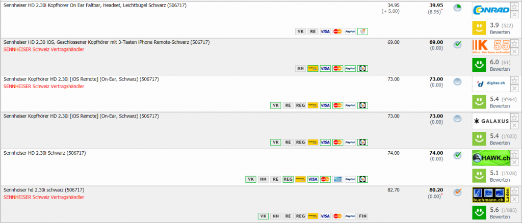 Bei Conrad gibt’s gerade den Sennheiser HD 2.30i Kopfhörer für CHF 39.95 (inkl. Lieferung, bei Bezahlung mit SOFORT). Zweitbester Preis beträgt derzeit CHF 69.90 Bestreis laut toppreise war bei CHF 59.-