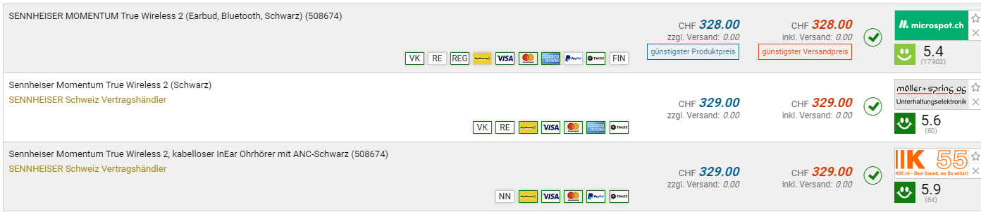 Sennheiser Momentum True Wireless 2 zum neuen Bestpreis bei Amazon Spanien, für umgerechnet 231 CHF. Lieferzeit in die Schweiz ist mit ca. 2 Wochen angegeben.
