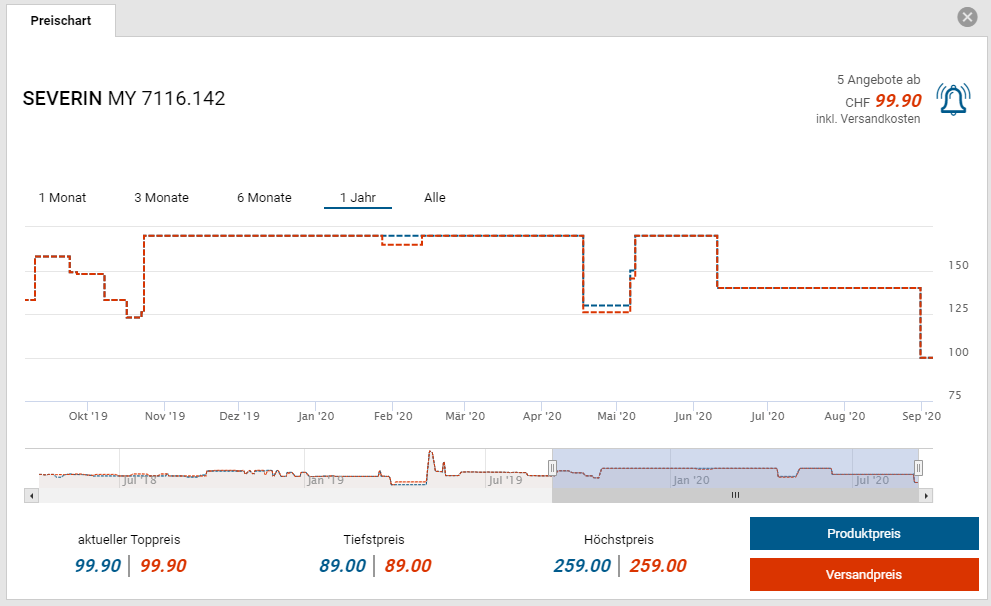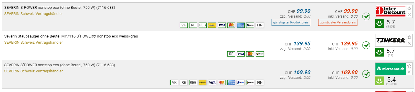 Bei Interdiscount gibt es den SEVERIN S´POWER Eco Staubsauger für den Bestpreis von CHF 99.90. Vor über einem Jahr gab es den Staubsauger für nur CHF 89.90. Der zweitbeste Preis beträgt CHF 139.95.