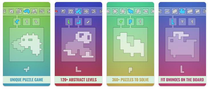 Each level has its own unique shape to fill and consists of three sublevels that need to be solved in order to unlock the next one. Each sublevel has its own omino type to use. Difficulty is scaling throughout the entire game. In the beginning, levels are really simple and teach how to play. After that, they get bigger, more complicated and challenging. There are over 120 levels in total to solve.