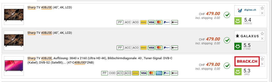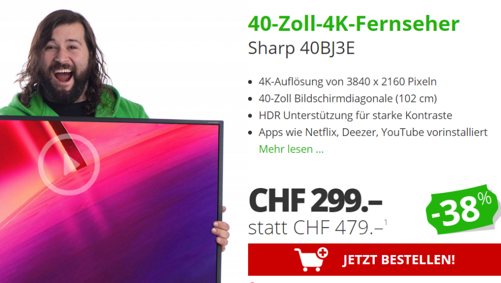 Bei Day Deal gibt es momentan de Sharp 40BJ3E Fernseher als Deal of the Week für den neuen Bestpreis von CHF 299.-. Leider ist keine Preiskurve und deshalb auch kein vorheriger Bestpreis auf TopPreise verfügbar. Das zweitbeste Angebot liegt jedoch bei CHF 479.-.
