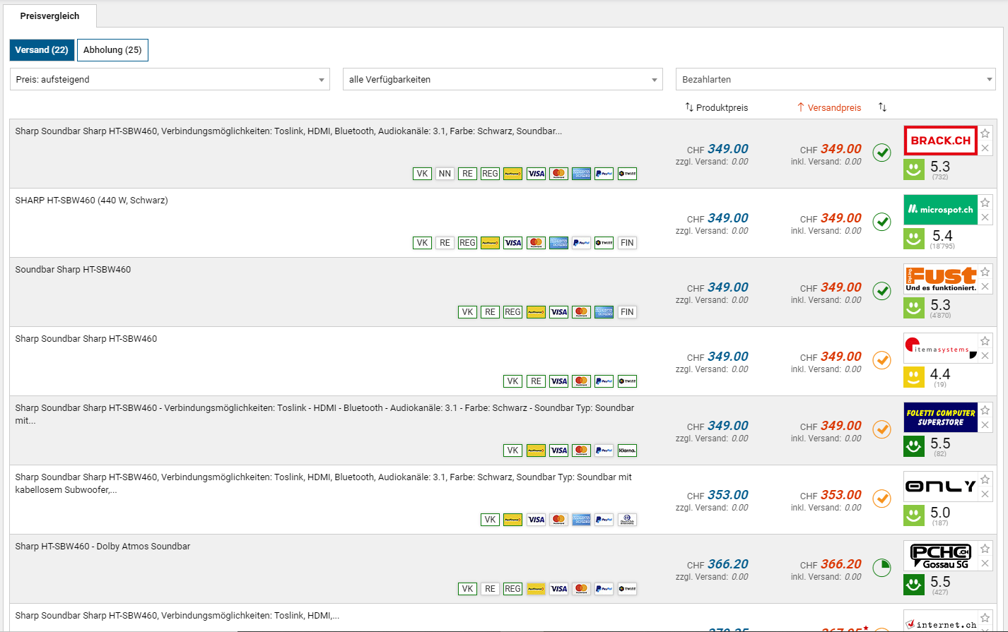 Bei Amazon gibts derzeit die 3.1 Soundbar HW-SBW460 von Sharp zum Aktionspreis von knapp 250 Franken inkl. Lieferung. Laut toppreise starten die Preise in der Schweiz bei fast 100 Franken mehr.