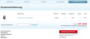 Gibt es tatsächlich einmal einen Gutschein bei Brack, ist dessen Eingabe etwas kompliziert. Zunächst musst du alle fünf Bestellschritte vollständig ausfüllen (inkl. Bezahlart). Erst im letzten Schritt bei Zusammenfassung kannst du unten einen Aktionscode einfügen. Du weisst also bis zu diesem Schritt nicht, ob der Gutschein tatsächlich funktioniert.