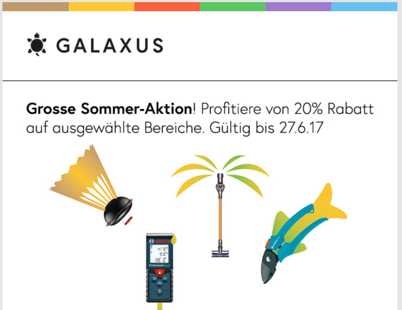 Unregelmässig erscheinende Rabattcodes: Auch Gutscheincodes gibt es bei Galaxus immer mal wieder. 20% aufs gesamte Reise-Sortiment, 10% auf alle Accessoires, 30% auf Schuhe und so weiter sind einige Beispiele dafür. Wann es solche Aktionen gibt, ist zum vornherein für uns Kundinnen und Kunden nicht klar. Oftmals gelten sie aber über einen etwas längere Zeitraum, meist über ca. zwei Wochen.
