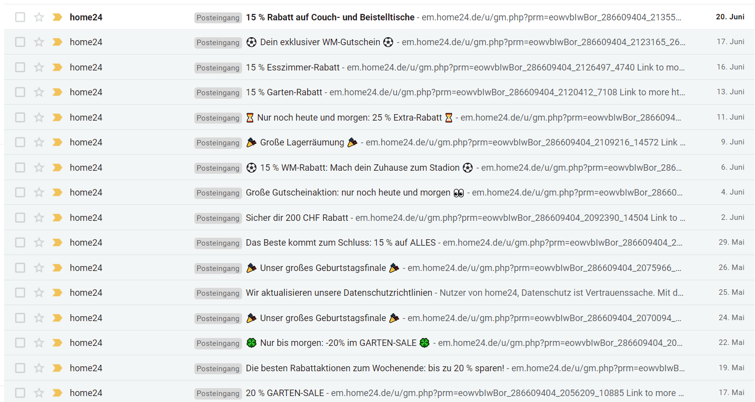 Auf www.home24.ch läuft eine Aktion (Homie Days mit 15% Rabatt auf z.B. diverse Möbel) Gültig noch bis Morgen 12.05.2020 um 09.00 Uhr.