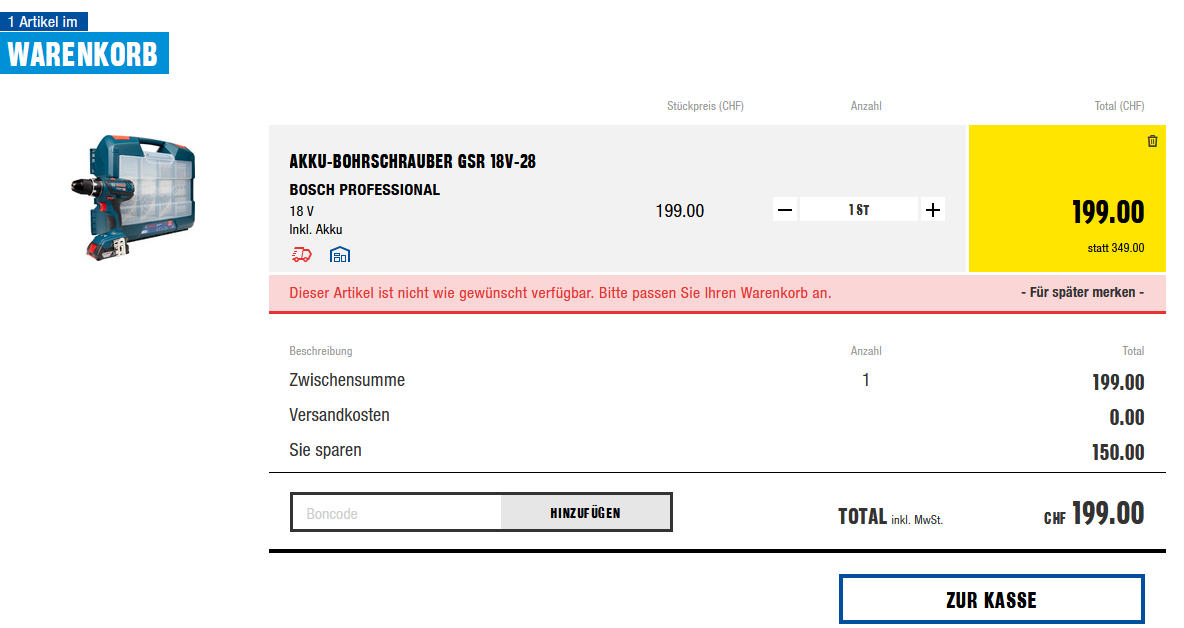 Jumbo bietet aktuell das Bosch Akku-Bohrschrauber EasyDrill Set inkl. Zubehör-Set (241-tlg.) + 2x 18V Akkus (1.5 Ah) Preis von knapp 90 Franken. Auf den Preis ...
