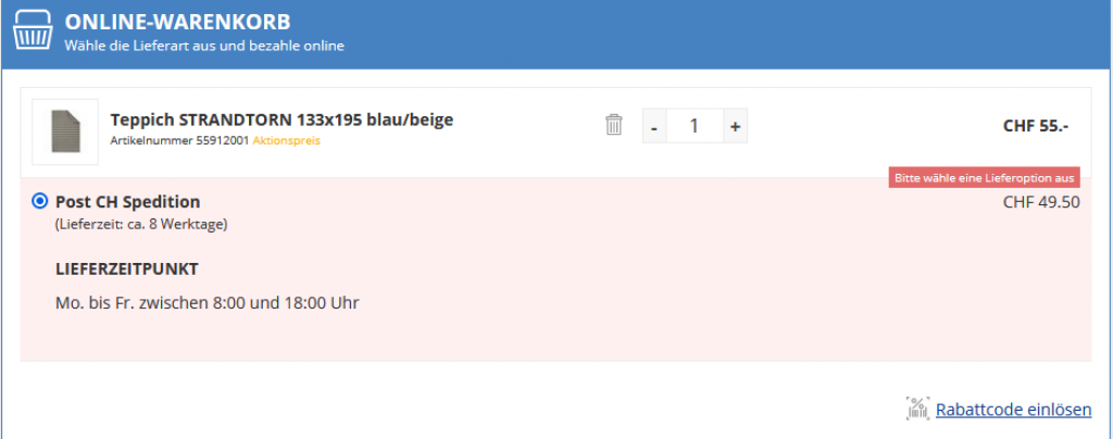 Jysk hat eine grosse Bandbreite an ausgewählten Produkten, bei denen dir dauerhaft ein besonders günstiger Preis angeboten wird. Ausserdem kann man in der Outlet-Sektion ständig nach Schnäppchen stöbern und diese auch finden. Durch regelmässige Aktionen wird das Sparangebot bei Jysk abgerundet. Häufig braucht man einen Gutscheincode, wenn man sich bei Jysk einen Rabatt sichern will. Nachdem du diesen Code bei uns gefunden hast, kannst du ihn im Shop eingeben. Dafür musst du in deinem Warenkorb eine Lieferoption auswählen und auf das Feld „Rabattcode einlösen“ klicken.