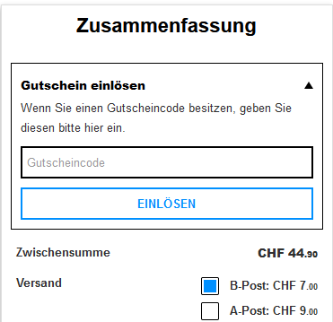- CHF 20.- Preisnachlass und kostenloser Versand ab einem Mindestbestellwert von CHF 99.-