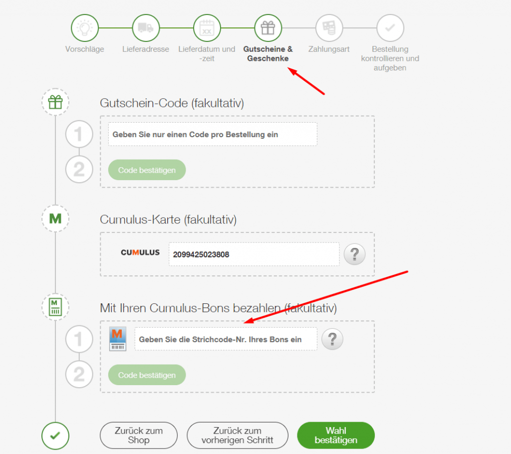 Geschenk Gutscheine / Cumulus Coupons bei Migros Online einsetzen