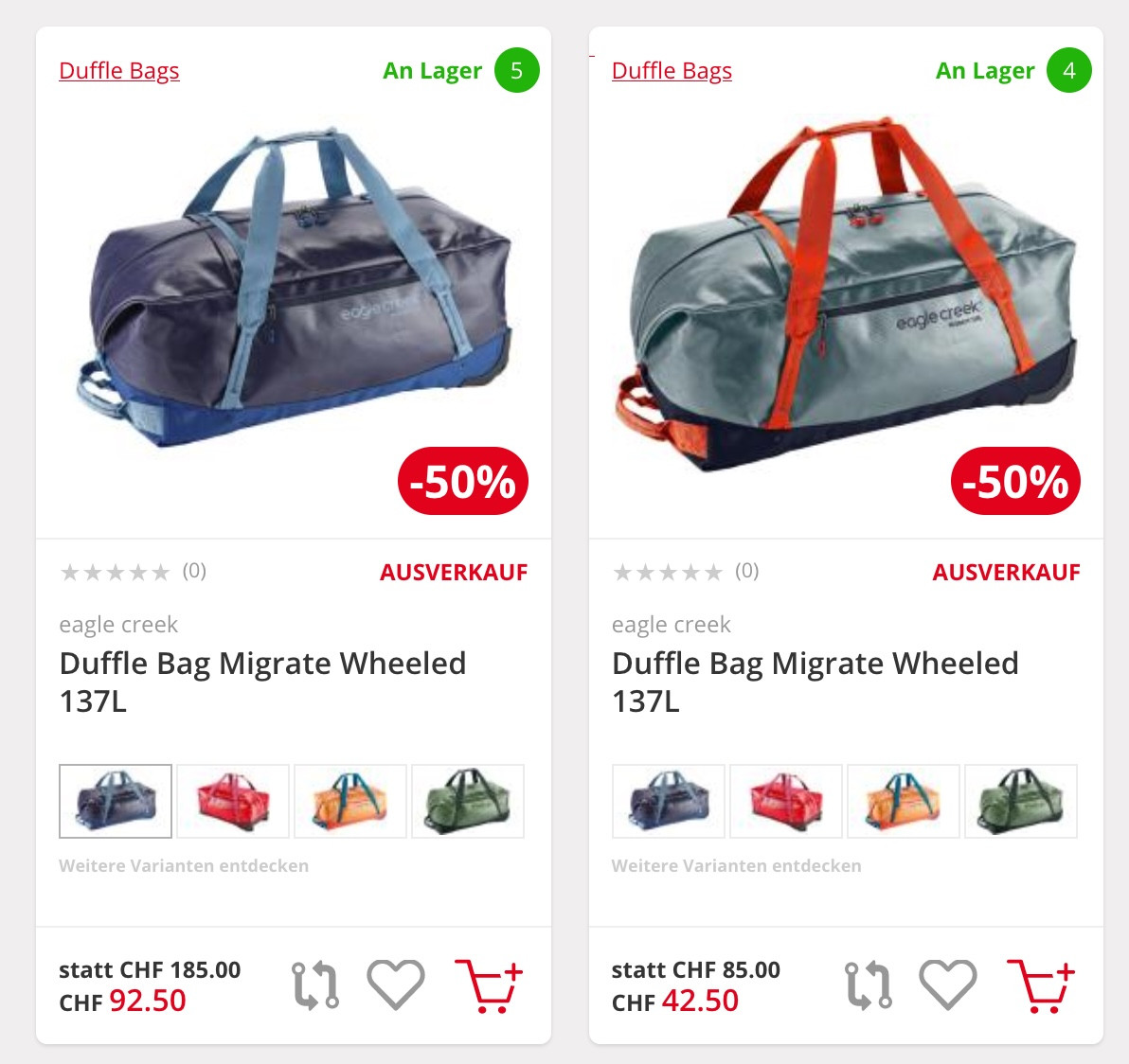 Danke, da sind gute Deals dabei! Ich würde sagen, es sind sogar mehrere Preisfehler bei Duffles/Reisetaschen von Eagle Creek dabei: