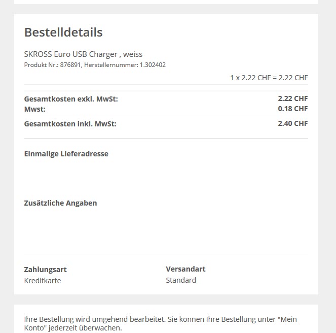 Versand fällt nicht an. Keine Mindermengenzuschlag (Siehe Bestellbestätigung weiter unten)