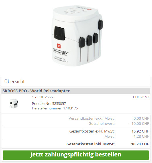 Bei ARP gibt es aktuell den SKROSS PRO World Reiseadapter (HerstellerNr: 1.103175) zum Bestpreis von CHF 18.20 wenn man sich vorgängig als Neukunde für den Newsletter (Startseite unten rechts) registriert, den Link in der Bestätigungsemail anklick und den anschliessend per E-Mail zugestellten CHF 10.- Rabattcode beim Checkout der Bestellung verwendet. Den nächstbesten Preis hat Techmania mit CHF 27.05.