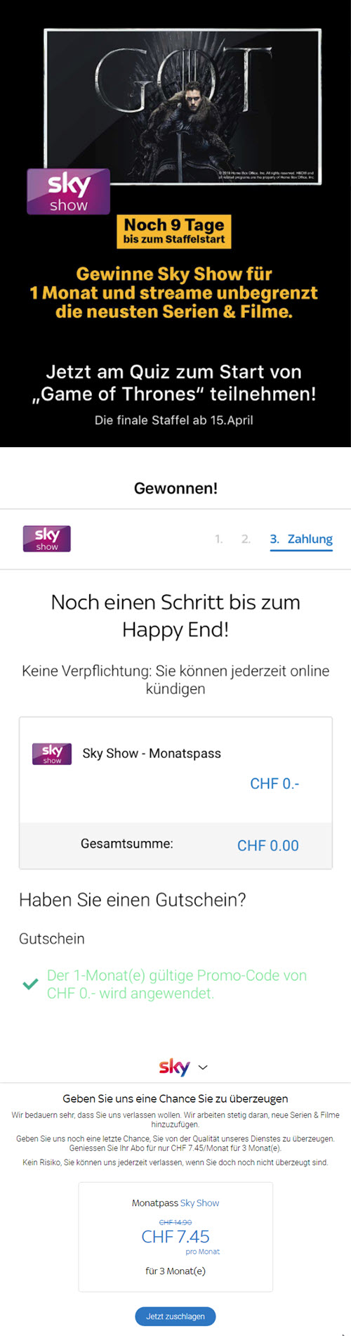 Bei der anschliessenden Registration bei Sky werden die Kreditkartenangaben benötigt. Da sich das Abo automatisch verlängert, falls nicht bis zum Ablauf des kostenlosen Monats gekündigt wird, empfiehlt es sich, in eurem Konto sicherheitshalber gleich wieder zu kündigen (Kündigungsgrund: Abo ist zu teuer). Mir wurde während diesem Prozess zusätzlich angeboten, das Abo zum halben Preis von CHF 7.45 / Monat für die nächsten drei Monate zu verlängern. Wer will, kann hier also nochmals profitieren…