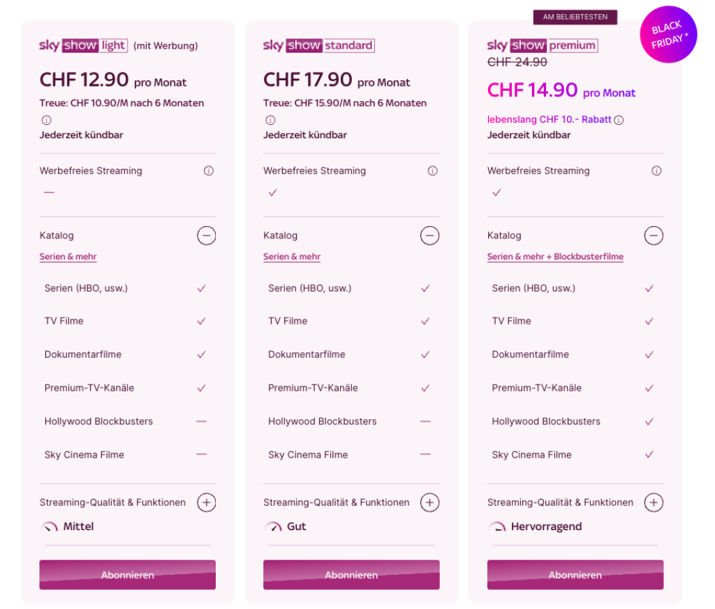 Zum Black Friday bietet Sky das Abo Sky Show Premium mit lebenslangem Rabatt von CHF 10.– an – statt CHF 24.90 nur CHF 14.90 pro Monat. Bis zu 4 Geräte können gleichzeitig streamen, in bis zu 4K-Qualität, also eine ideale Gelegenheit zum Testen und vom lebenslangem Rabatt zu profitieren.