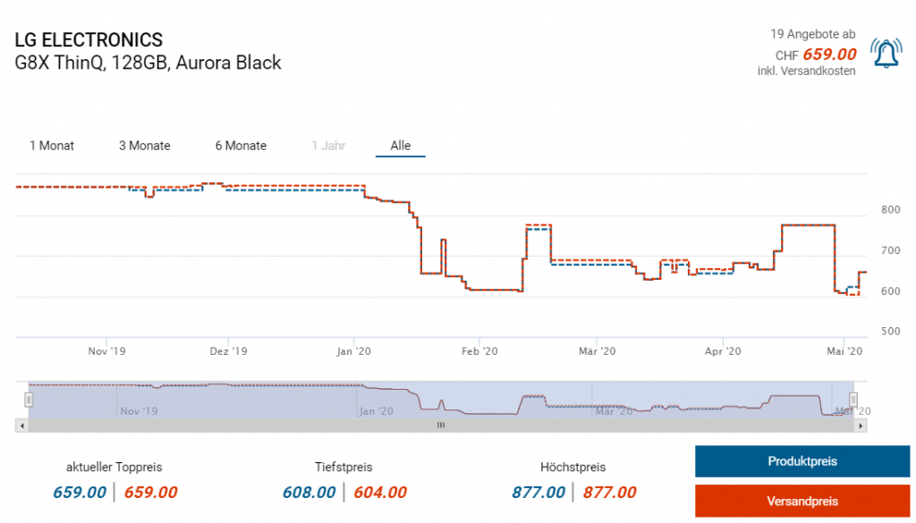 Bin gerade auf die Seite de.camelcamelcamel.com (was für ein Name...) gestossen. Schon spannend, wie die Preise auf amazon rauf und runter gehen. Mit Preisalarm, interessante Site. Dieses Handy war am 8. März Euro 444, vor ein paar Stunden noch Euro 519 und jetzt Euro 599 (von der Camel-Site noch nicht erfasst).
