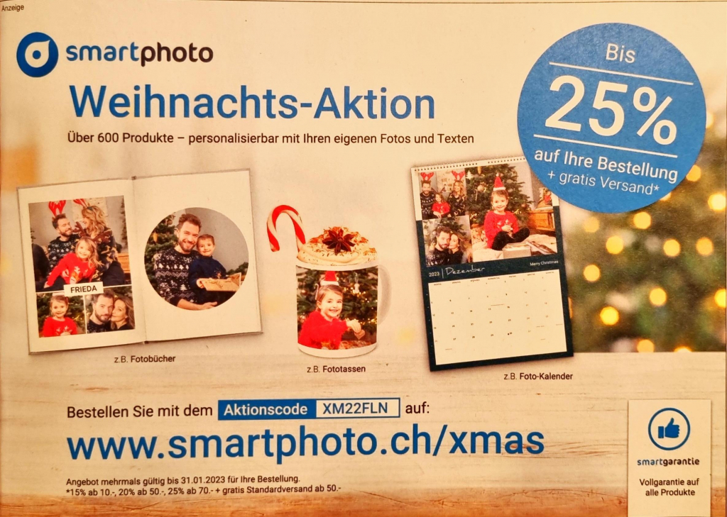 Mit dem Gutscheincode XM22FLN gibt es bis zu 25% Rabatt und gratis Versand. Ideal für Weihnachten für Fotobücher, Fototassen oder Fotokalender. Über 600 Produkte personalisierbar.