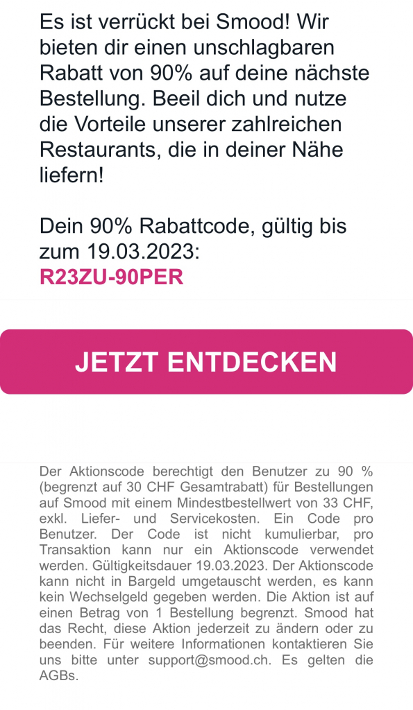 Bei Smood gibt es momentan 30 CHF Rabatt bei einem Mindestbestellwert von 33 CHF excl. Liefer- und Servicegebühr. Wie immer nur einmal pro Account nutzbar.