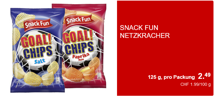 Im Aldi könnt ihr euch auch langsam auf die kommende Fussballzeit einstellen, in dem ihr euch die Fussball-Chips zulegt. Diese sind in den Geschmacksrichtungen Salz und Paprika für CHF 2.49 erhältlich.