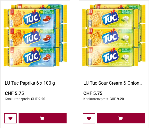 Im Otto’s gibt es diese Woche die feinen TUC in der Groisspackung 6 x 100 für CHF 5.75. Dies in den Geschmacksrichtungen Paprika und Sour Cream & Onion.