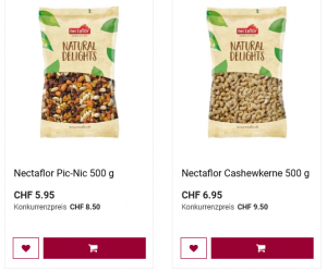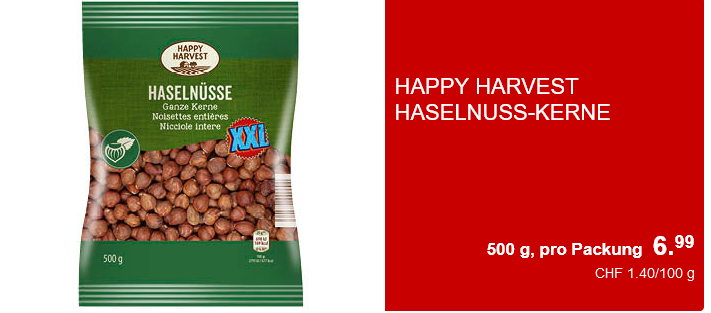 Aus dem Aldi habe ich eine Grosspackung Haselnüsse ausgesucht. Es hat sie zwar nicht jede/r gerne, aber es war der einzige salzige Snack in Aktion und jeder Shop soll eine Chance erhalten.
