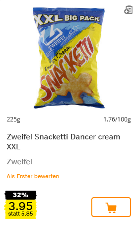 Im Coop gibt es diese Woche die XXL-Packungen von Snacketti in den Sorten Bacon, Paprika Shells und Dancer Cream für je CHF 3.95. Zu den Dancer Cream musste ich einfach ein 90-er Jahre Musikvideo mitgeben. Viel Spass 🙂 .
