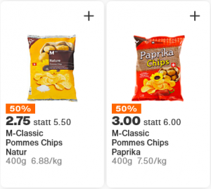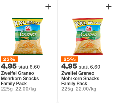 In der Migros erhält ihr die 400g-XL-Packung in der Sorte nature oder Paprika zum halben Preis von CHF 2.75 bzw. CHF 3.00. Falls ihr diese nicht so gerne mögt, gebe es als Alternative noch die Graneo-Chips in Aktion zu 25 %: