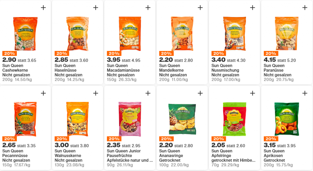 In der Migros möchte ich euch einen Sammeldeal präsentieren. Momentan sind viele (alle ?) Produkte der Marke Sun Queen mit 20 % in Aktion. Es hat sicher für jeden etwas dabei. Nachfolgend eine Auswahl nicht repräsentativer Produkte (da jeder einen eigenen Geschmack hat):