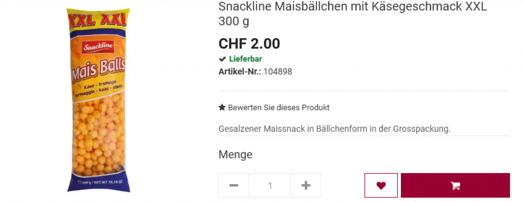 Im Otto’s findet ihr zum Dauertiefpreis von CHF 2.00 die XXL-Packung der Snackline Maisbällchen. Im Denner auch erhältlich für CHF 2.95, falls dieser näher wäre, als der nächste Otto’s.