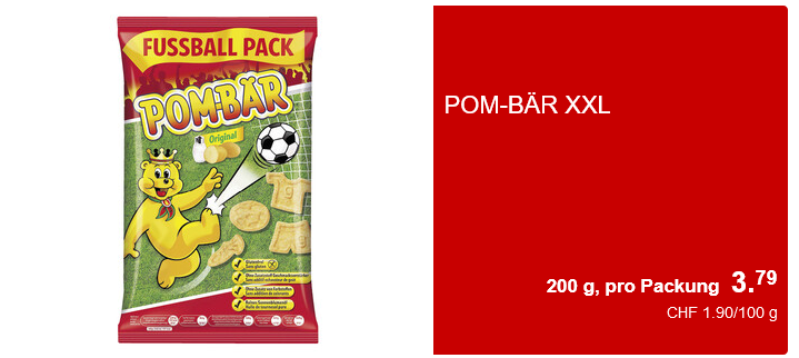 Im Aldi habe ich für euch die Pom-Bär Fussball-Edition herausgepickt für CHF 3.79 in der 200g-Packung.
