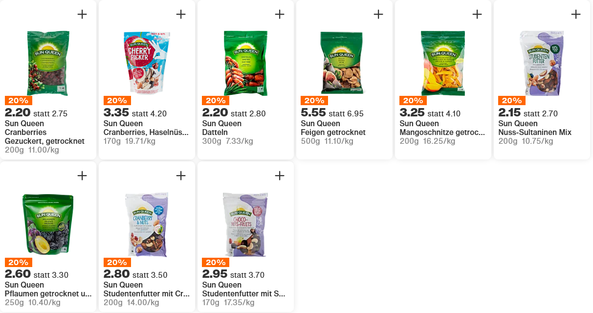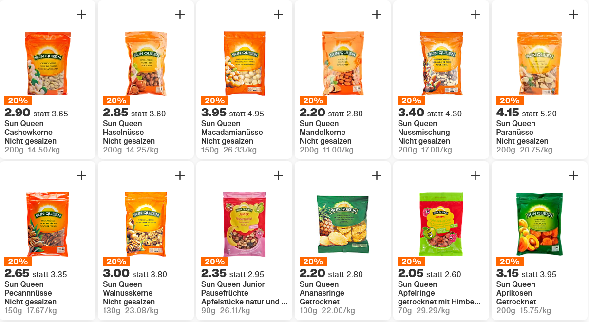 In der Migros möchte ich euch einen Sammeldeal präsentieren. Momentan sind viele (alle ?) Produkte der Marke Sun Queen mit 20 % in Aktion. Es hat sicher für jeden etwas dabei. Nachfolgend eine Auswahl nicht repräsentativer Produkte (da jeder einen eigenen Geschmack hat):