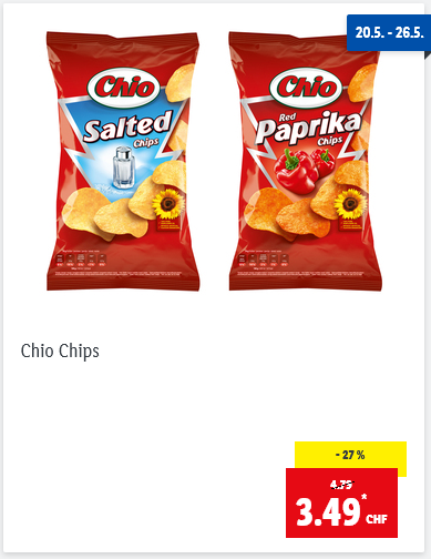 Im Lidl findet ihr (einige sollen richtig verrückt danach sein) die Chio-Chips mit 27 % für CHF 3.49 in den Geschmäcker gesalzen und Paprika, aber erst ab morgen den 20.05.2021.