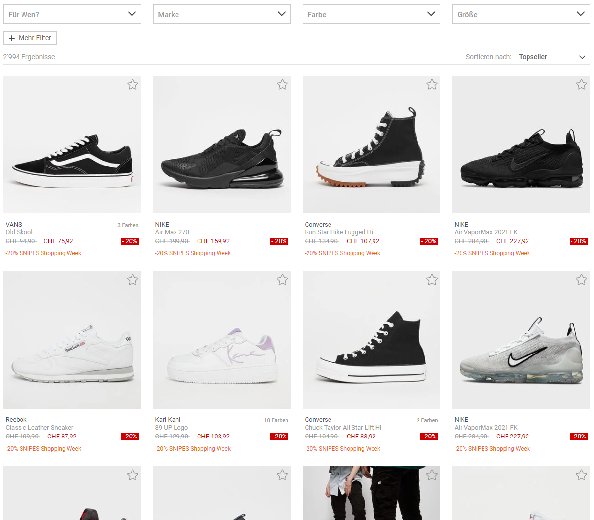 Bei Snipes gibt’s aktuell eine riesige Auswahl an fast 3000 Artikeln, welche mit 20-30% Rabatt vergünstigt sind. Es sind einige sehr gute Schnäppchen dabei, so z.B meine absoluten Lieblingsschuhe die Nike Court Vintage Premium für CHF 75.92.
