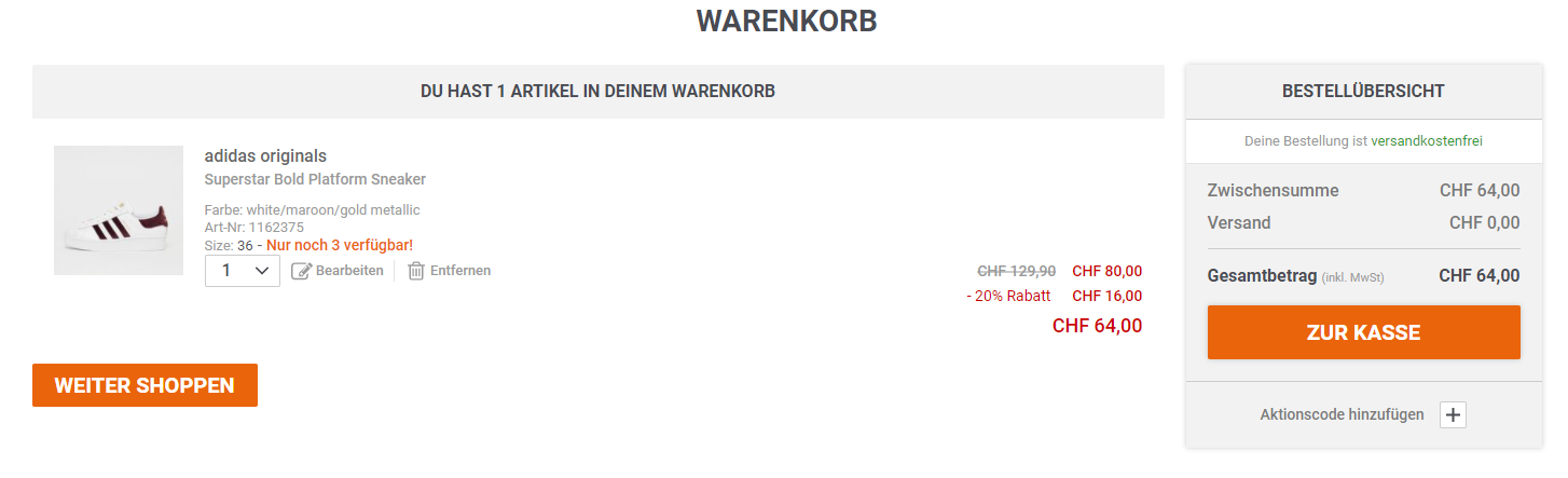 Es gibt keinen Mindestbestellwert und keine Lieferkosten. Es hat aber nicht mehr alle Grössen und nicht mehr allzu viele Stückzahlen, daher lohnt es sich schnell zu sein 😀