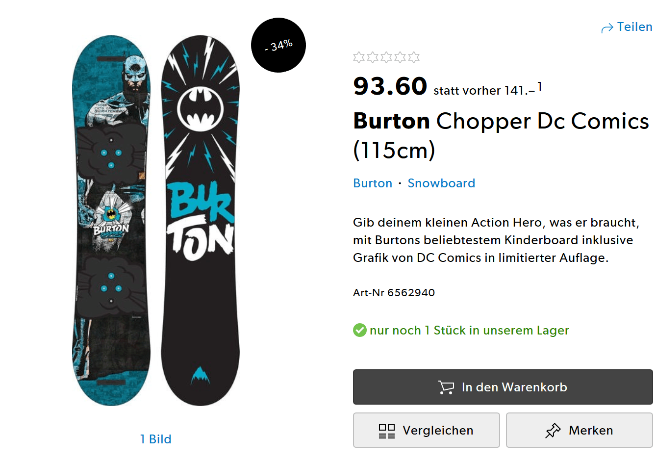 Wichtig ist, dass man dazu noch eine Bindung braucht. Aber ein wirklicher top Preis. Die anderen Grössen kosten egal ob kleiner oder Grösser jeweils 216 CHF.