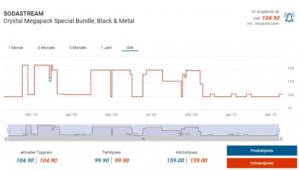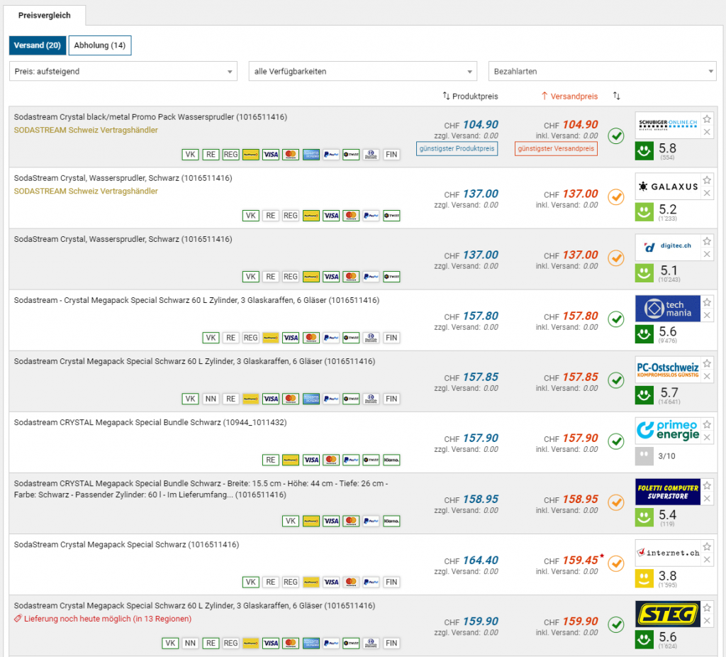 Bei nettoshop gibts derzeit die Sprudelmaschine Sodastream Crystal im Promo Pack mit 2 Trinkgläsern für CHF 99.90. Wenn ihr den Warenkorbwert auf 100 Franken auffüllt, z.B. mit diesem Filter, könnt ihr den 10 Franken Bon anwenden und weiter sparen. Laut toppreise liegt der Vergleichspreis für dieses Set bei etwa 105 Franken.