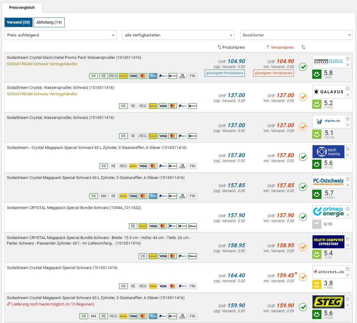 Bei nettoshop gibts derzeit die Sprudelmaschine Sodastream Crystal im Promo Pack mit 2 Trinkgläsern für CHF 99.90. Wenn ihr den Warenkorbwert auf 100 Franken auffüllt, z.B. mit diesem Filter, könnt ihr den 10 Franken Bon anwenden und weiter sparen. Laut toppreise liegt der Vergleichspreis für dieses Set bei etwa 105 Franken.
