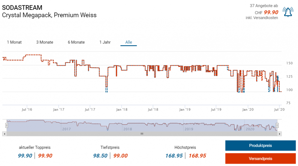 Bei nettoshop gibts derzeit das Megapack von Sodastream wieder einmal in Aktion. So zahlt ihr mithilfe eines Füllartikels abzgl. dem 10 Franken Gutschein noch ca. 92 Franken, der zweitbeste Preis liegt laut toppreise derzeit bei ca. 105 Franken.