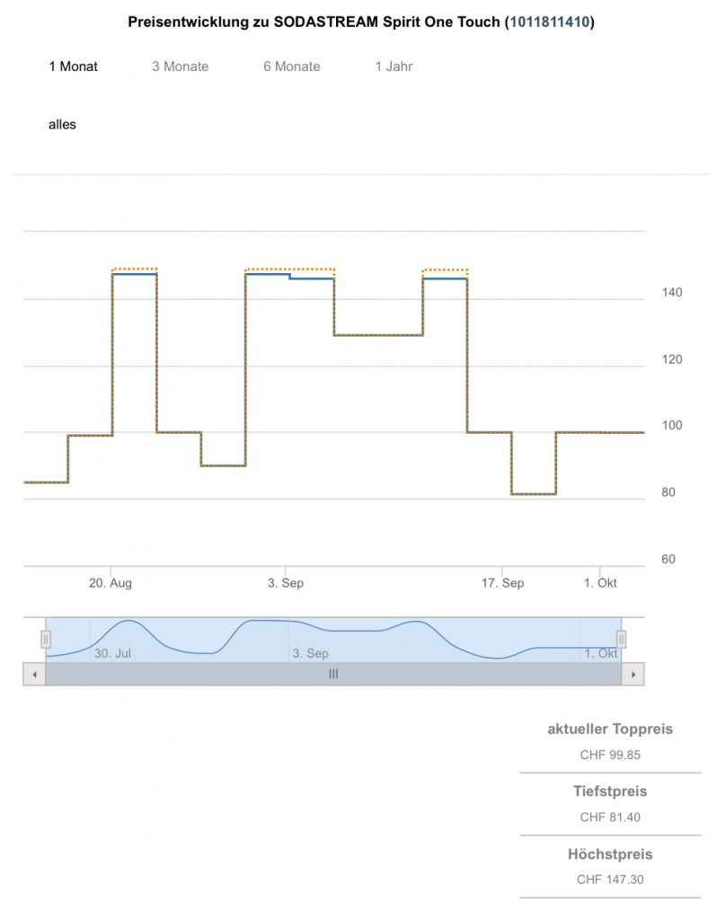 Gemäss toppreise gab es die Sodastream bislang nie günstiger als für 81.40 CHF, der zweitbeste Preis liegt aktuell bei 99.95 CHF.