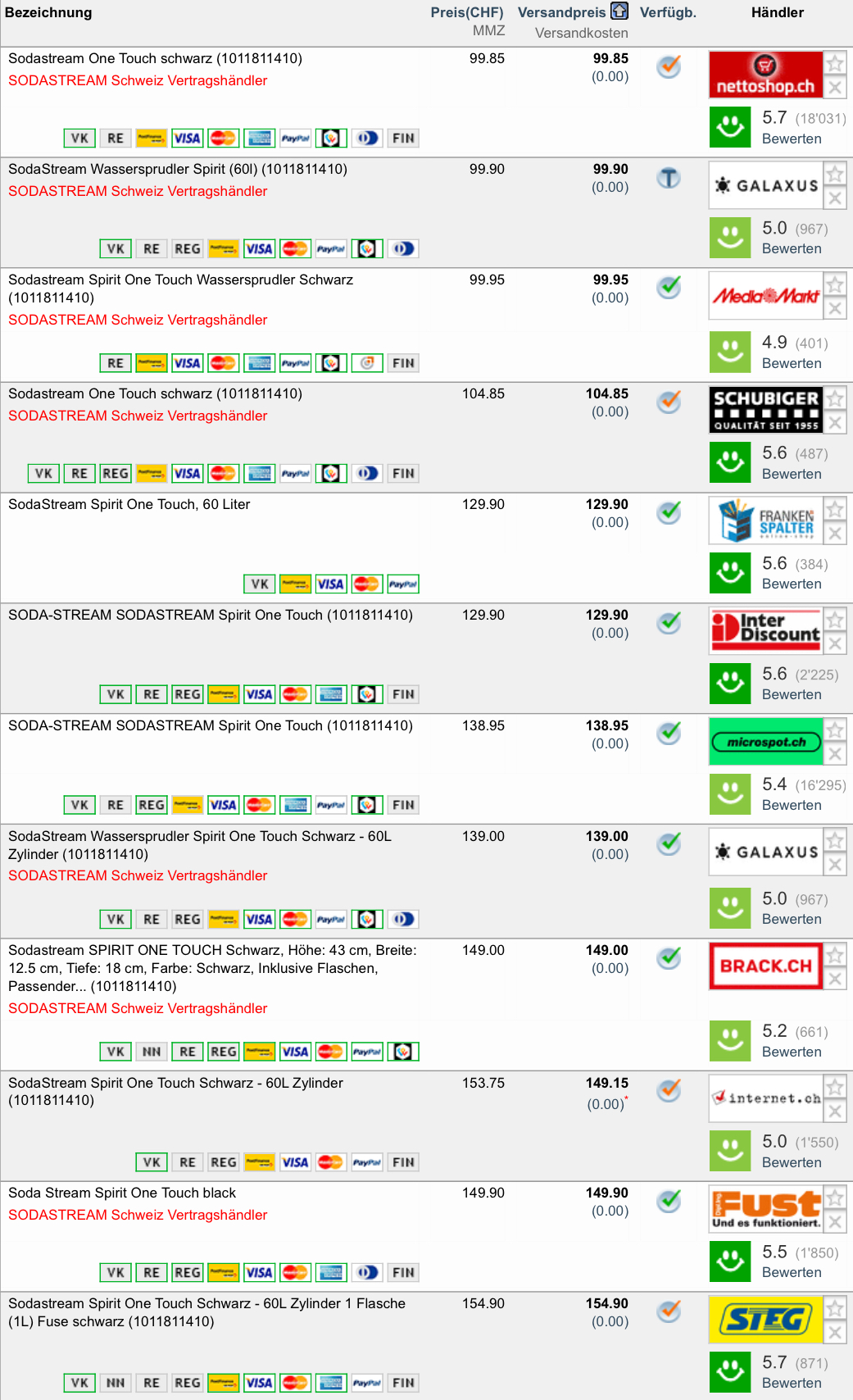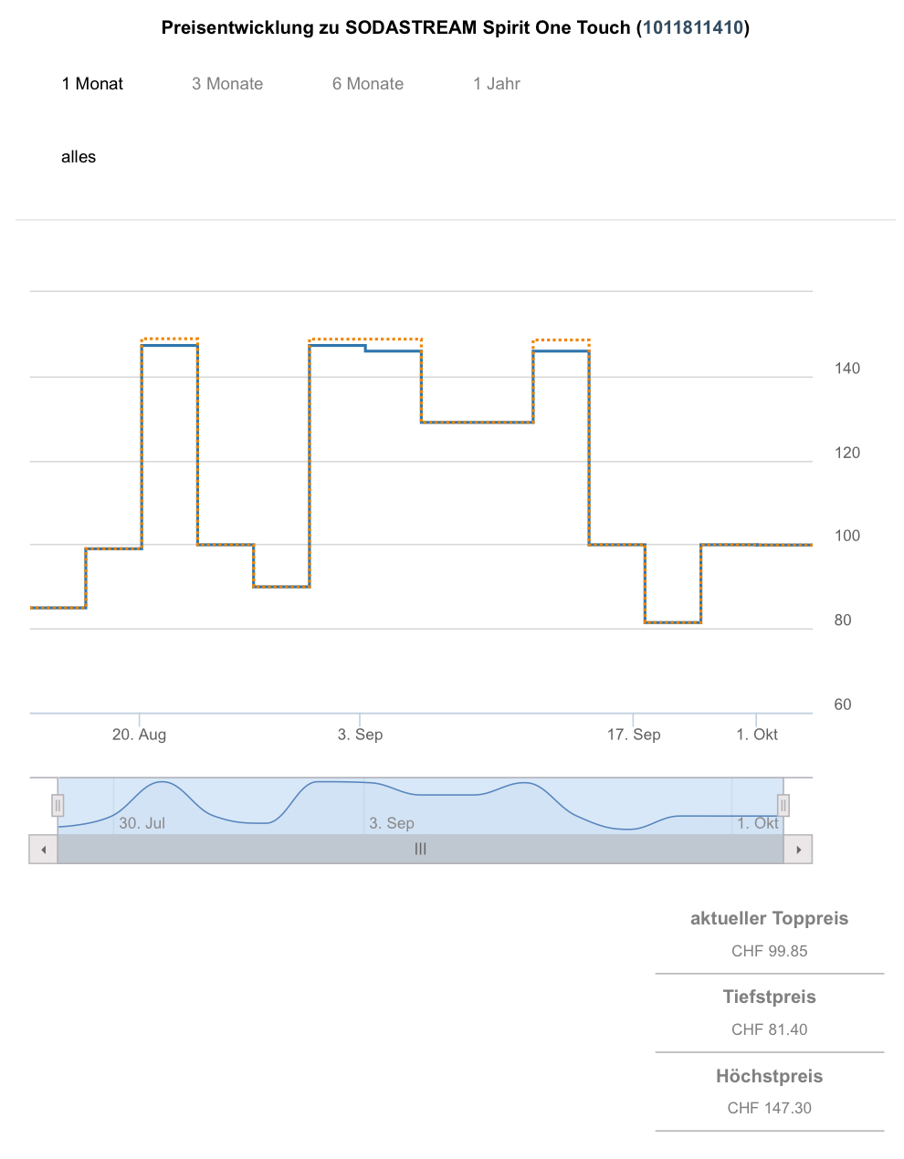 Gemäss toppreise gab es die Sodastream bislang nie günstiger als für 81.40 CHF, der zweitbeste Preis liegt aktuell bei 99.95 CHF.