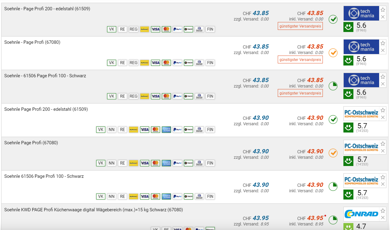 Bei Amazon gibts derzeit die digitale Küchenwaage Page Profi von Soehnle zum Aktionspreis von knapp 24 Franken. Mit Lieferungsgebühren (da Bestellwert unter 39€) kommt man allerdings auf 30 Franken. Falls man noch andere Dinge einkauft und den Mindestbestellwert für den gratis Versand erreicht, spart man sich dessen Kosten.