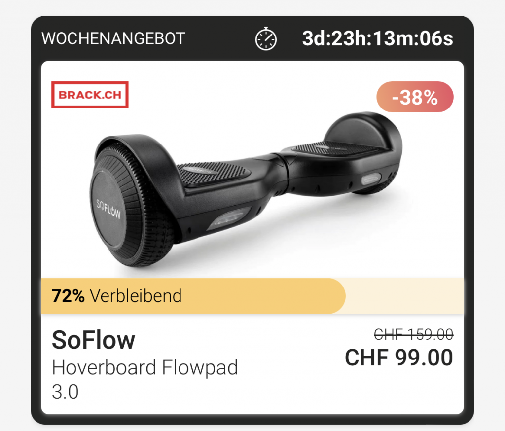 Noch bis Ende Woche gibt es in der Twint App den SoFlow Hoverboard Flowpad 3.0 für nur 99.- CHF statt 159.- CHF. Zweitbester Preis 138.- CHF. Also ein super Schnäppli.