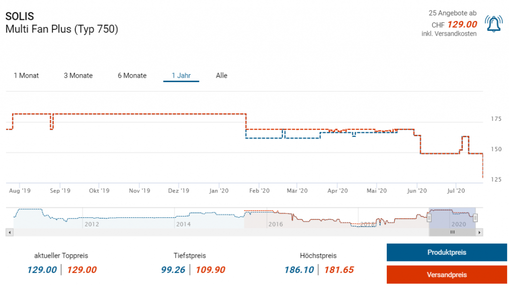 Bei nettoshop gibts derzeit den Ventilator Fan Tastic Typ 750 von Solis im Tagesangebot für 129 Franken. Mit dem bekannten 10 Franken Gutschein drückt man den Preis allerdings auf 119 Franken runter, was laut toppreise kein Bestpreis ist, aber nahe herankommt.