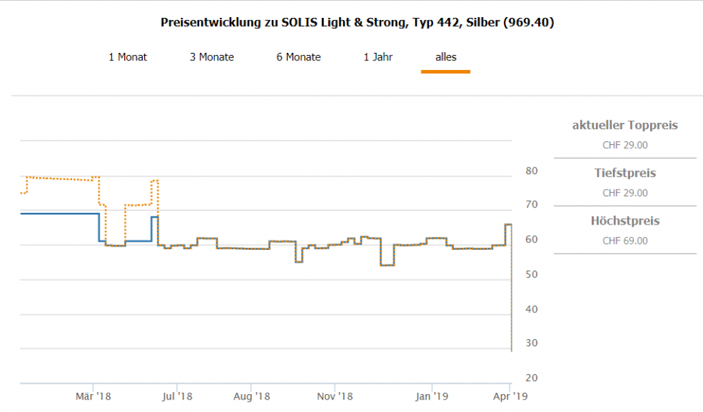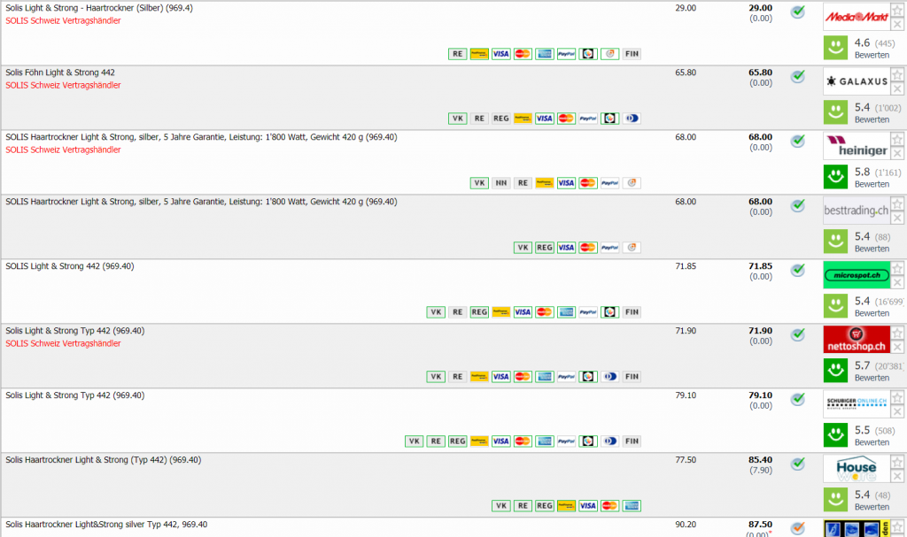 Bei MediaMarkt erhält man gerade den Solis Light & Strong Föhn für CHF 29.- Zweitbester Preis beträgt CHF 65.80