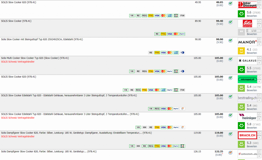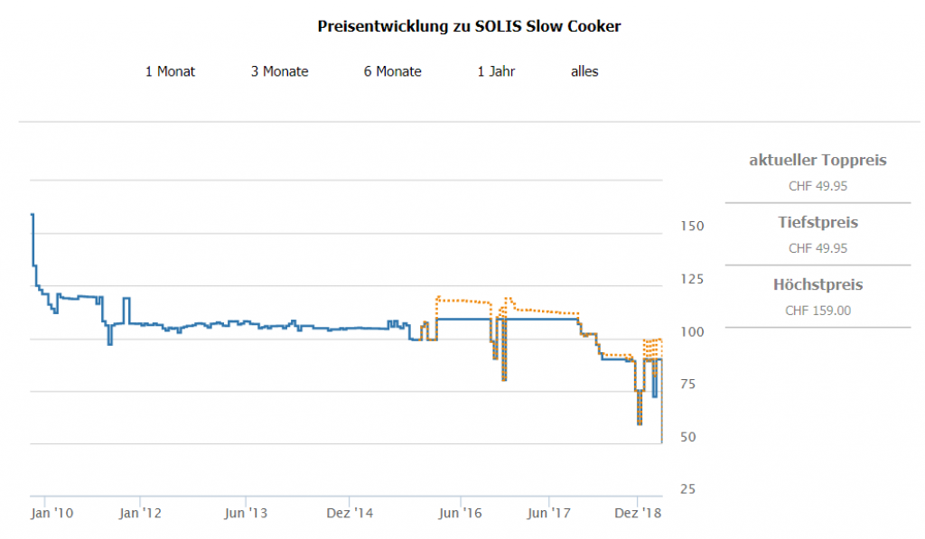 Bei Interdiscount gibt’s den SOLIS Slow Cooker 820 derzeit für CHF 49.90 Bis wann die Aktion gilt, ist leider unbekannt. Zweitbester Preis in der Schweiz liegt bei CHF 99.40, Bestpreis war bei CHF 59.-