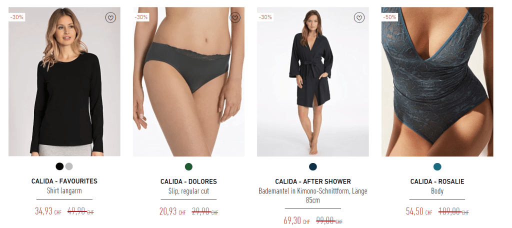 Auch Calida startet in den Sommer-Ausverkauf. Momentan gibt’s knapp 350 Artikel für Damen und etwas über 100 Artikel für Herren, die man mit einem Rabatt von 30% einkaufen kann. Zudem ist die Lieferung bei CALIDA immer gratis, ohne Mindestbestellwert.