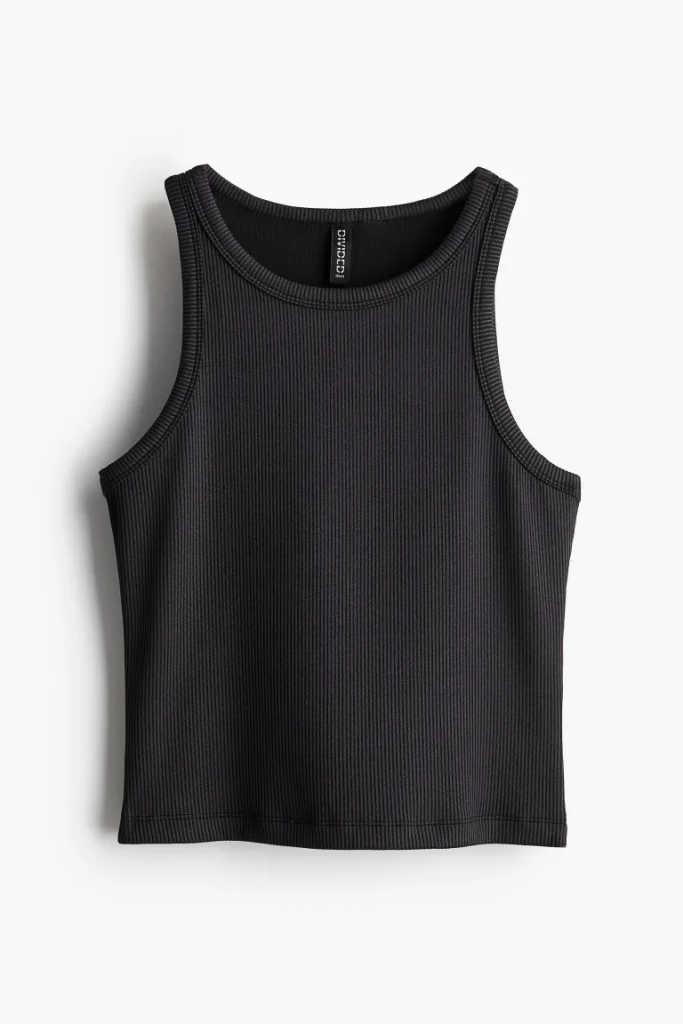 Geripptes Tanktop: Erhältlich in Schwarz und Hellgrau, Größen von XXS bis M.