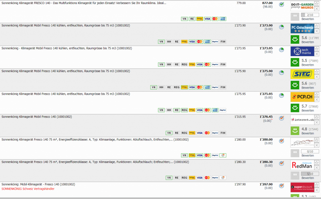 Der zweitbeste Preis für das Klimagerät liegt bei CHF 1’273.90 Der bisher günstigste Preis lag bei CHF 1063.30. Hier der Preisvergleich, die bekannten Namen wie Brack und Galaxus sind noch teurer, sodass sie es nicht einmal auf den Screenshot geschafft haben. Der Preis von CHF 769.- bezieht sich auf die Abholung. Für die Lieferung verlang doitgarden horrende 98 Franken. Wenn du noch einen 2x / 5x / 10x Cumulus Gutschein hast, wäre das auch der Zeitpunkt, diesen einzusetzen.