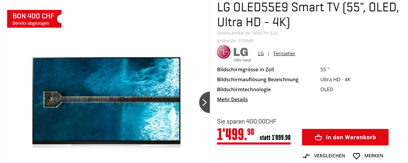 LG OLED55E9 Smart TV (55″, OLED, Ultra HD - 4K) für CHF 1`499.90