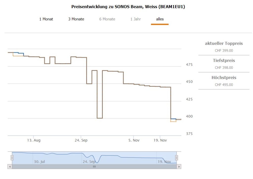 Mit dem Fust-Trickli kann man sich die Sonos Beam White momentan für CHF 369.- sichern. Der zweitbeste Preis in der Schweiz liegt bei CHF 399.- Der Bestpreis war bei CHF 395.-