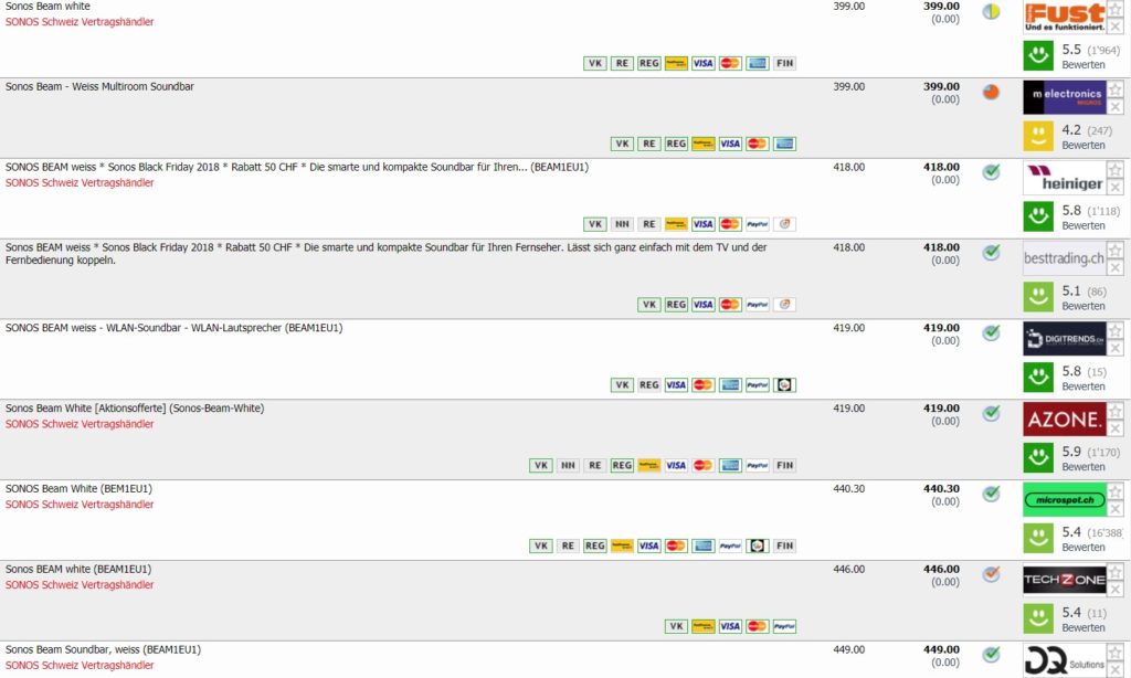 Mit dem Fust-Trickli kann man sich die Sonos Beam White momentan für CHF 369.- sichern. Der zweitbeste Preis in der Schweiz liegt bei CHF 399.- Der Bestpreis war bei CHF 395.-